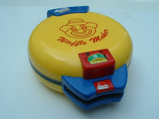 Hier kann jedes Kind seine eigene (Kunststoff) -Waffel backen. Es gibt zwei Waffeln (eine hell und eine dunkel) - eine davon legt man in das Waffeleisen und schließt den Deckel. Dann dreht man den Regler auf 3 und wartet bis das Waffeleisen einen Siganlton erzeugt - jetzt ist die Waffel "fertig" und man kann die nächste backen. Alles geht mit zwei Batterien und die Kinder haben einen rießen Spaß.