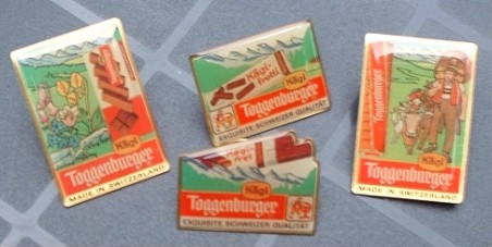 Es gibt die PIN´s in vielflältiger Form für alles was man sich so vorstellen kann. Am bekanntesten sind wohl die PIN´s, die an Wanderhüte o. ä. stecken. Hier sieht man vier Stück der Waffelfirma Toggenburger (Kägi-fretti) aus der Schweiz. Typische, schweizerischer Merkmale - Alpen, Kühe, Wiesen -einfach eine wunderschöne Landschaft!