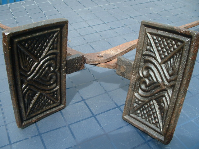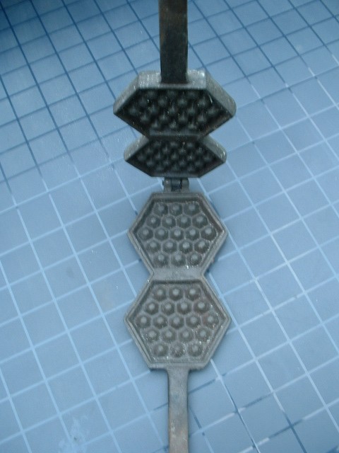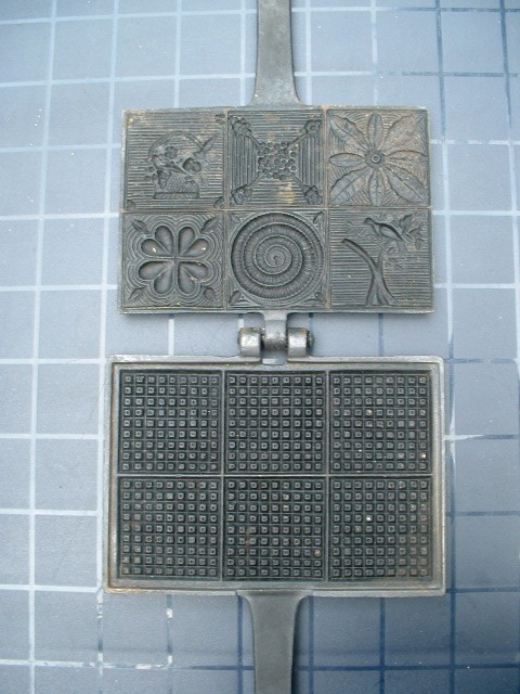 ...ganz am Anfang der "Waffeleisengeschichte" versuchte man mit Hilfe zweier Eisenplatten Teig über dem offenen Feuer zu backen. Irgendwann wurden dann die zwei Eisenplatten mit Hilfe von Zangenarmen verbunden, damit man besser backen kann. Dies wurde verfeinert und konnte schon sehr gut eingesetzt werden.